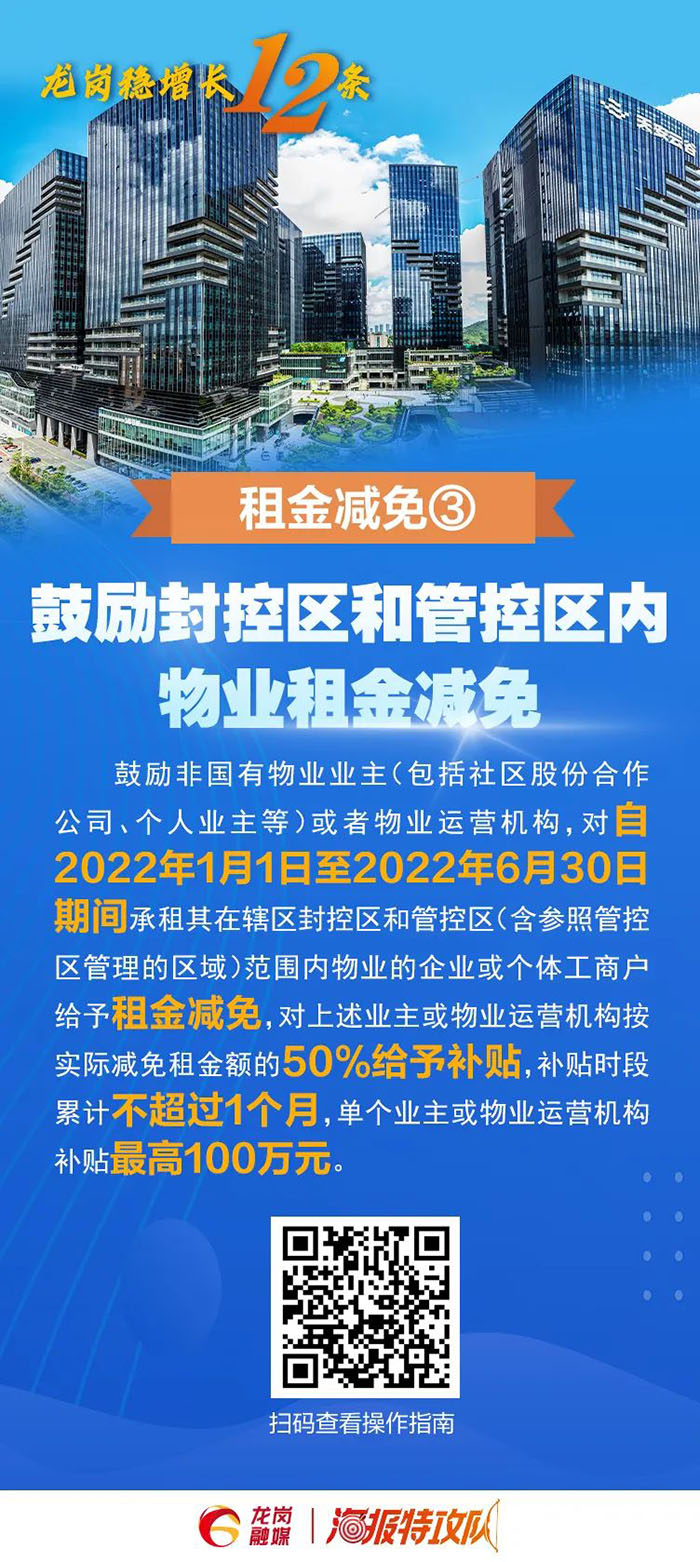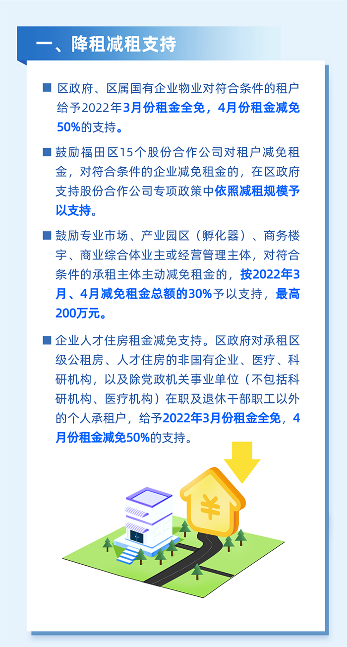 鼓勵倡導(dǎo)其他市場主體參照減免物業(yè)租金。對2022年3月1日至5月31日期間實(shí)際減免租金60萬元以上的社區(qū)股份合作公司(按歸屬社區(qū)股份合作公司的租金計算),及經(jīng)營管理工業(yè)園區(qū)、寫字樓、商場等物業(yè)的企業(yè),按其減免實(shí)際租戶租金的20%予以支持,單家企業(yè)最高200萬元。(牽頭單位:區(qū)投資推廣和企業(yè)服務(wù)中心)