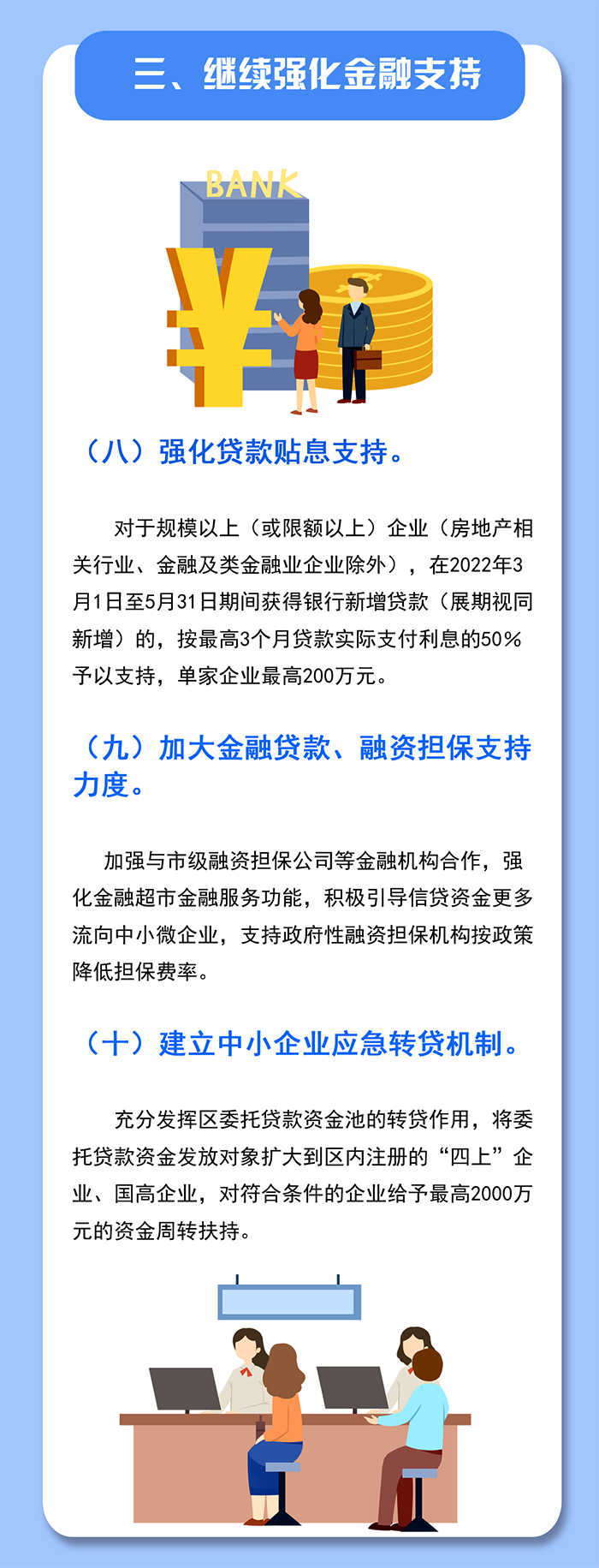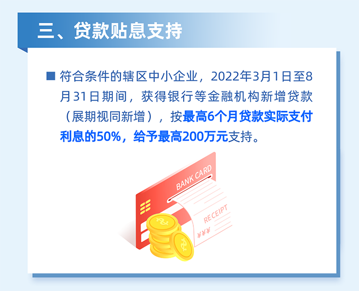 8.金融助力中小微企業(yè)發(fā)展,降低企業(yè)融資成本,對南山區(qū)中小微企業(yè)在2022年2月16日至4月30日期間(以發(fā)放貸款時間為準(zhǔn)),獲得銀行等金融機(jī)構(gòu)貸款(含展期)的,按實(shí)際支付利息最高50%給予貼息支持,貼息期限不超過3個月,每家企業(yè)不超過50萬元。(責(zé)任單位:區(qū)金融發(fā)展服務(wù)中心)