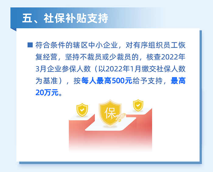 5.對南山區(qū)企業(yè)在深圳居住的員工,居住地自2022年2月1日至3月31日期間,因疫情防控被劃定為封控區(qū)、管控區(qū)(含參照管控區(qū)管理區(qū))而影響正常工作的,根據(jù)企業(yè)實(shí)際受影響的員工人數(shù)給予企業(yè)一次性社保補(bǔ)貼。按企業(yè)為受影響員工上月實(shí)際繳納社會保險費(fèi)的30%且每人不超過600元,給予每家企業(yè)最高不超過10萬元的社保補(bǔ)貼。(責(zé)任單位:區(qū)人力資源局)