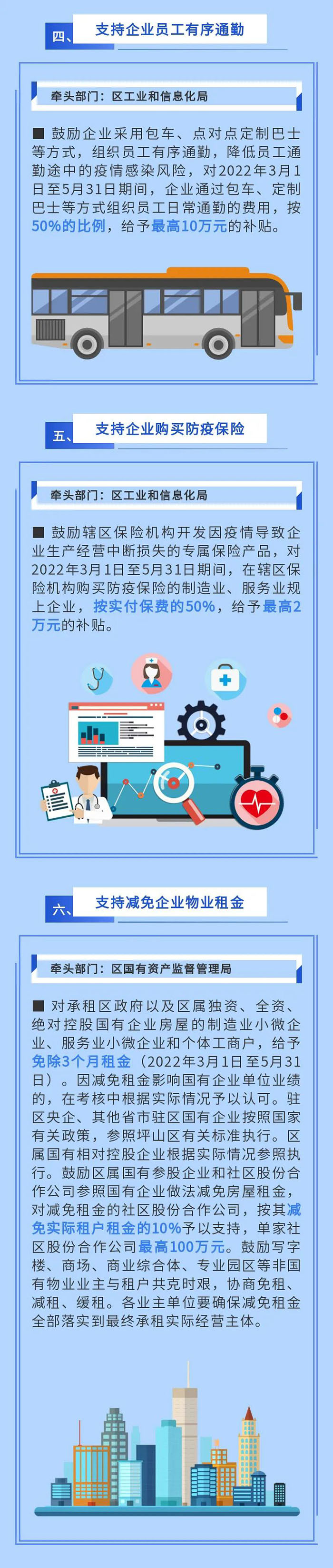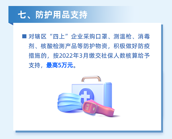 實(shí)施防疫保險補(bǔ)貼。對2022年3月1日至5月31日期間,購買防疫保險產(chǎn)品和服務(wù)的企業(yè),按照實(shí)付保費(fèi)的50%予以支持,單家企業(yè)最高5萬元。(牽頭單位:區(qū)金融工作局)